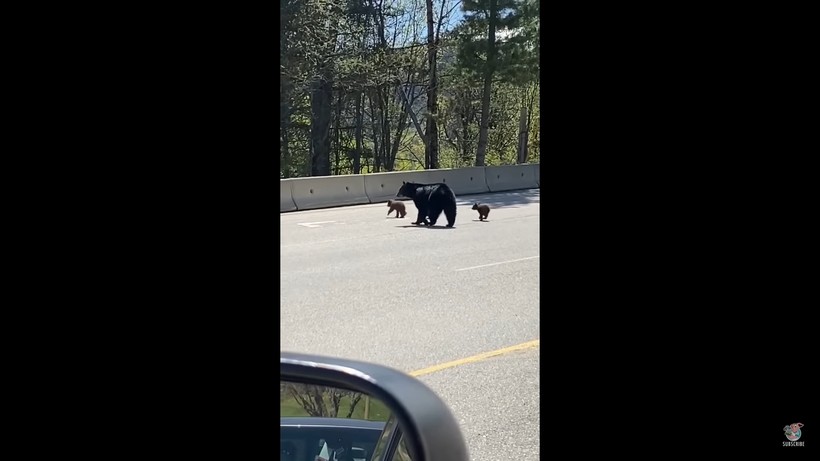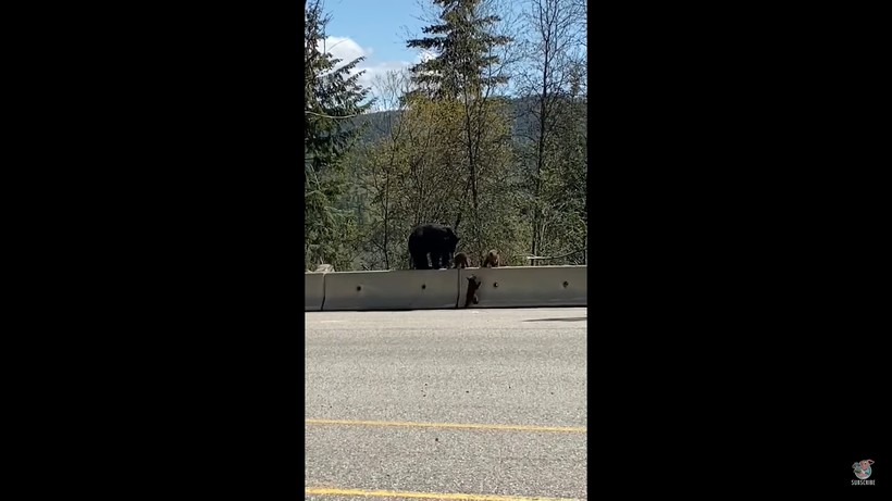 Проживая в Канаде, стоит быть готовыми к тому, что на дороге можно увидеть бурого медведя, да не одного, а с семьей. Так случилось с жительницей города Россленд, Британская Колумбия. Во время поездки на машине вместе с двумя детьми она столкнулась с мамой-медведицей. Самка с детенышами переходила дорогу через баррикаду в безопасное место. По словам автора ролика, «это был обучающий день как для медведицы, так и для нее самой».