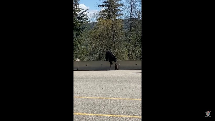 Дело в том, что один из трех медвежат никак не мог перелезть через высокий бетонный забор и метался возле него, не видя мамы и двух братьев, которые уже были на другой стороне ограждения. Медведица вернулась за малышом, но он все еще не мог залезть наверх. Тогда случилась забавная вещь: один из медвежат спустился на дорогу и показал брату, как надо перелезать баррикаду. Тогда малыш «последовал совету» и смог преодолеть преграду. Автор видео комментировала и объясняла все происходящее своим детям, а также зрителям видео.