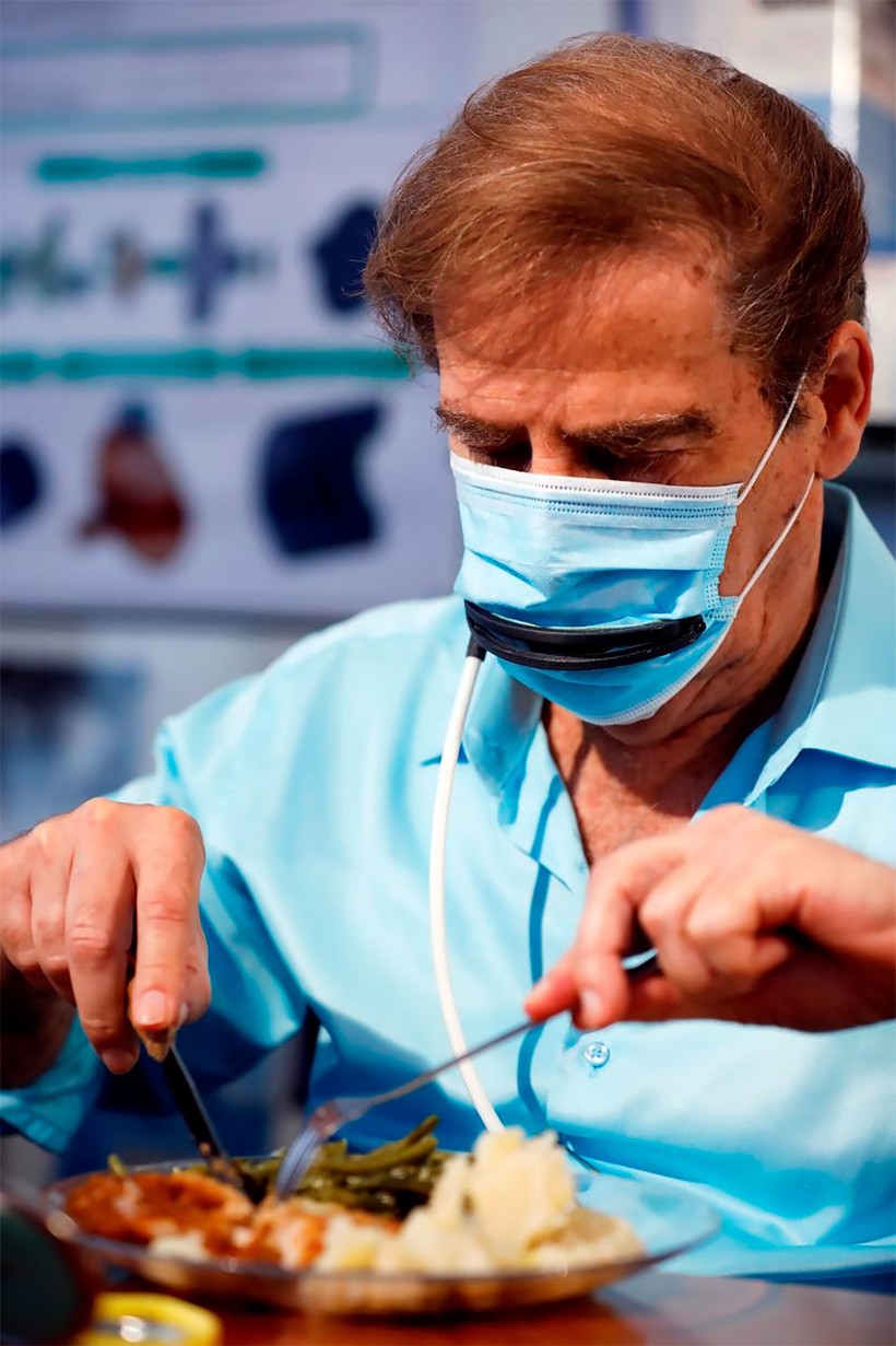 Они разработали коронавирусную маску с пультом дистанционного управления, которая позволяет людям есть, не снимая ее. Авторы изобретения говорят, что с приемом мороженого или соусов могут возникнуть проблемы. Но если вы поглощаете что-то твердое, то сложностей не будет.
