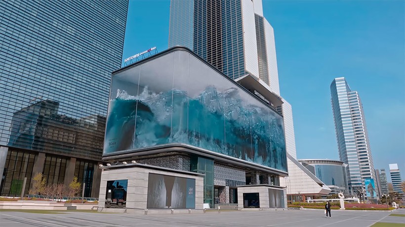 В столице Южной Кореи, Сеуле, находится самый крупный уличный дисплей в мире. Но сегодня он выглядит точь-в-точь как гигантский аквариум, из которого вот-вот на улицу плеснет громадная волна. На самом деле это анаморфная иллюзия. И она самая впечатляющая и огромная на нашей планете в данный момент.
