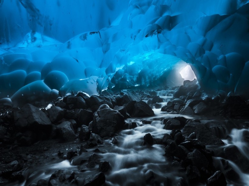 Ледяные пещеры находятся под ледником Менденхолл на Аляске. Сюда можно добраться на каяках, на вертолете или пешком. Однако из-за активного таяния льдов существовать леднику осталось недолго.