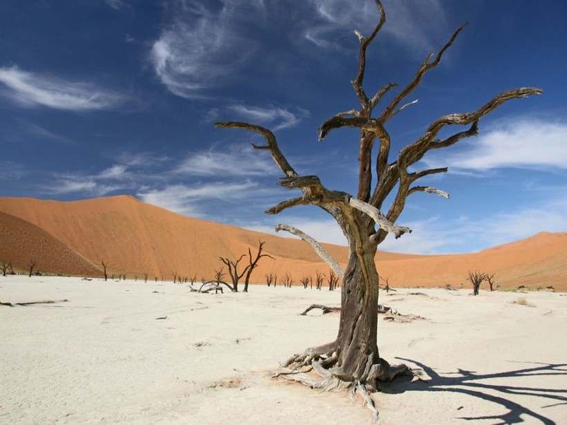 Deadvlei дословно переводится как «мертвое болото». Оно окружено самыми высокими песчаными дюнами, а также многочисленными скелетами деревьев. Эта область высохла около 900 лет тому.