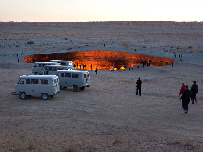Непрестанно полыхающий газовый кратер называют "Дверью в Ад" или "Дверью в преисподнюю". Это место было открыто советскими учеными в 1971 году, диаметр кратера составляет около 60 метров, а глубина – приблизительно 20 метров.