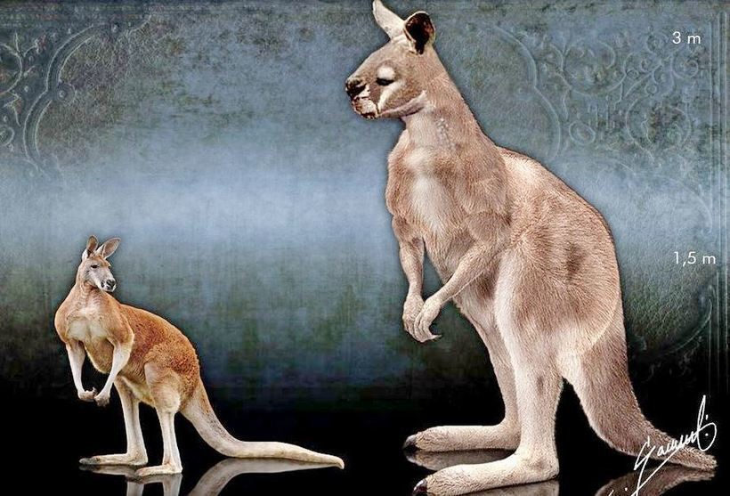 Другие гиганты, населявшие Австралию в эпоху первобытных людей, — это млекопитающие. Они были представлены несколькими видами кенгуру, самые огромные из которых достигали 2,7 метра. Это кенгуру прокоптодоны, которые вымерли около 18 тысяч лет назад, а также еще один ископаемый вид кенгуру, останки которого были найдены недавно и пока изучаются. К счастью, они были травоядными и не представляли непосредственной угрозы для людей, хотя вовсе не исключено, что они могли проявлять агрессию по отношению к людям во время сезона размножения или если чувствовали угрозу для детенышей. Но первобытные австралийцы со временем научились охотиться на прокоптодонов и, возможно, стали причиной их исчезновения.