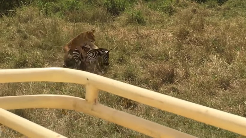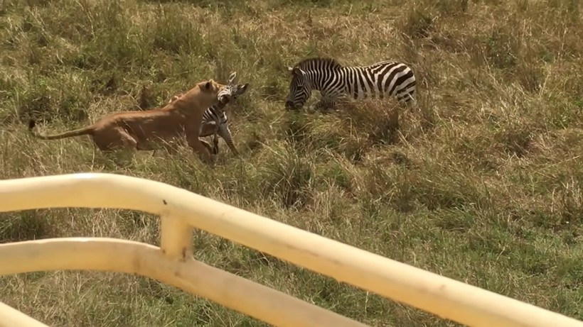 Львица повалила малыша на землю и вцепилась в горло. Крик ужаса и страха прокатился над равниной, не оставив туристов равнодушными к жеребенку. Казалось, что его время на этом свете истекло. Но тут на подмогу прибежала мама-зебра. Она бросалась на львицу до тех пор, пока та не отпустила малыша. Мать ударила обидчицу задними копытами и убежала вместе с «ребенком» за стадом. Львица же осталась сидеть в высокой траве, пораженная своим проигрышем и несостоявшимся обедом. Пользователи YouTube удивились, как мать бесстрашно вступила в бой за своего малыша. Обычно зебры могут дать отпор львам, но предпочитают спасаться бегством. Этот случай стал исключением.