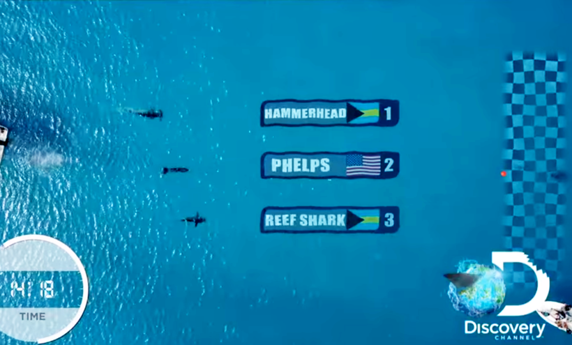 Плавательная дорожка длиной 50 метров была организована прямо в открытом море. Во время своей спортивной карьеры Майкл неоднократно совершал заплывы длиной 50 метров, и его лучшее время составляло чуть больше 23 секунд. Но во время заплыва у берегов Бимини, когда на Фелпсе был надет моноласт, он преодолел этот промежуток всего за 18,7 секунды. Тем не менее этого оказалось недостаточно для того, чтобы опередить акулу-молота — хищница прошла дистанцию за 15,1 секунды. Правда, олимпийский чемпион оказался не хуже всех: ему удалось на 0,2 секунды опередить рифовую акулу.