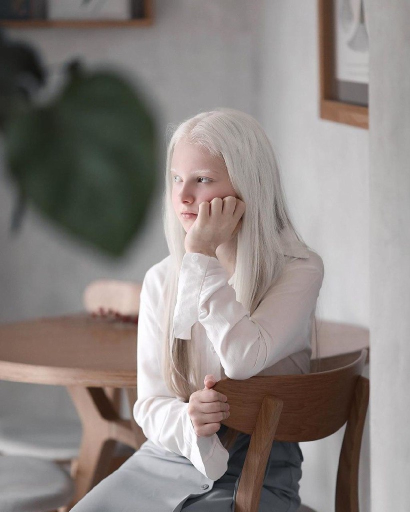 У Амины два редких генетических отклонения: гетерохромия и альбинизм. Первая мутация отвечает за необыкновенный цвет глаз девочки: при гетерохромии отличается оттенок радужной оболочки, отчего глаза могут быть совсем непохожи или один глаз может иметь какие-то вкрапления. Такое случается при переизбытке в одной радужной оболочке меланина по сравнению с другой: именно поэтому у девочки такие поразительные глаза. Альбинизм же ― это отсутствие меланина, который отвечает за цвет волос и кожи. Эти мутации соединились в Амине очень гармонично, и только подчеркивают ее особенную внешность.