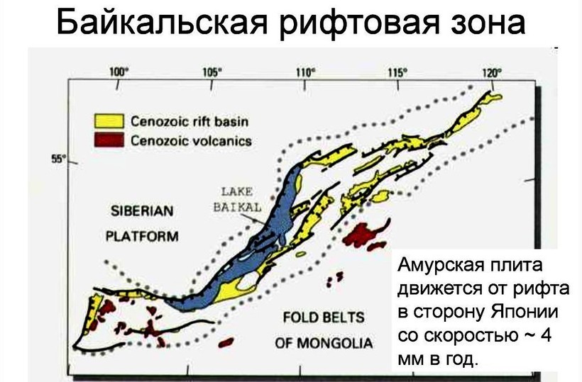 Дно Байкала — это то место, где происходит раздвижение двух массивных участков земной коры. Именно поэтому гигантская трещина имеет такую грандиозную глубину, а ширина Байкала медленно, но верно увеличивается. Западный берег озера — это массивная Евразийская плита, а восточный принадлежит более скромной Амурской плите, которую чаще называют микроплитой. Амурская плита медленно движется в сторону юга и юго-востока, продолжая раздвижение дна озера Байкал.