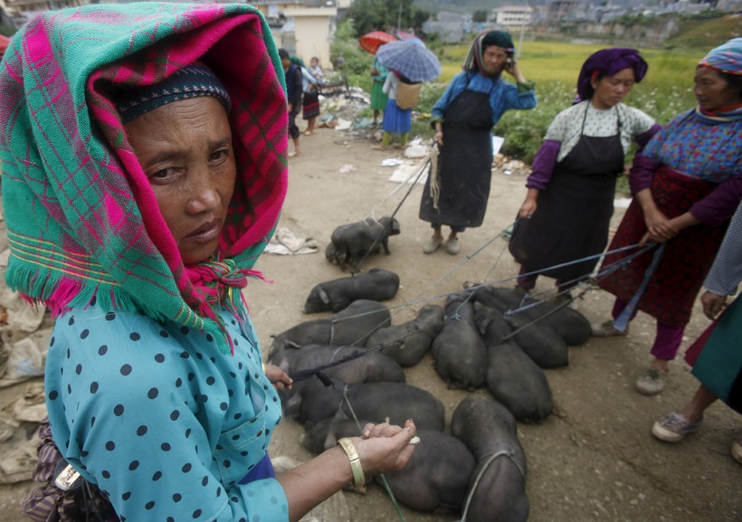 На фото представлен местный рынок, на котором продают очень необычных для нас черных поросят.