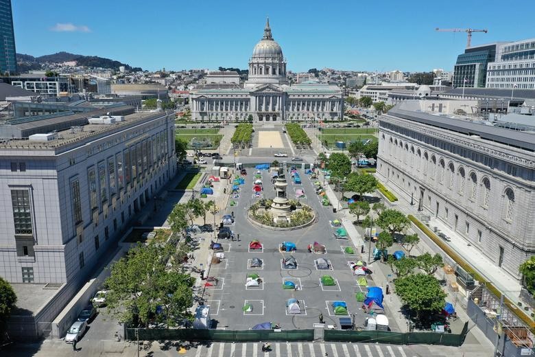 Палаточный городок для бездомных в Сан-Франциско, разбитый с учетом социального дистанцирования.