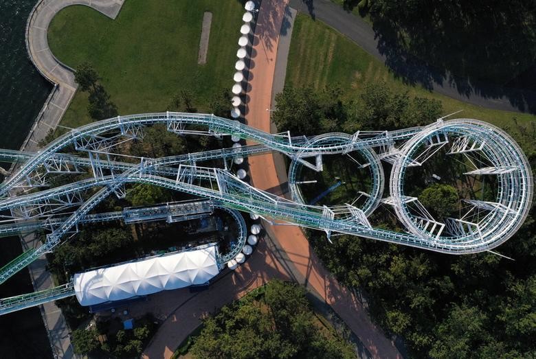 Застывшие американские горки в японском парке аттракционов Yokohama Hakkeijima Sea Paradise.