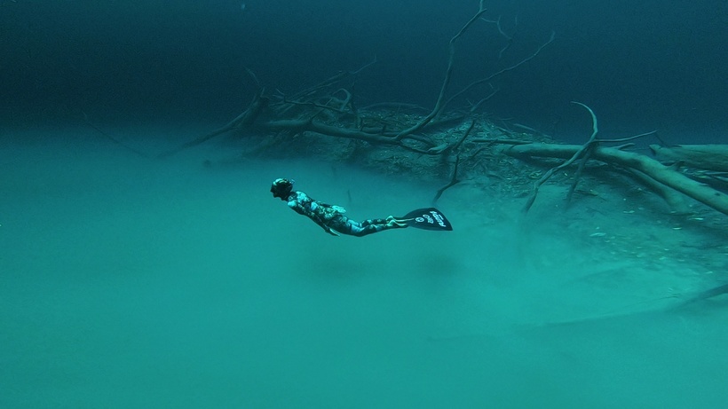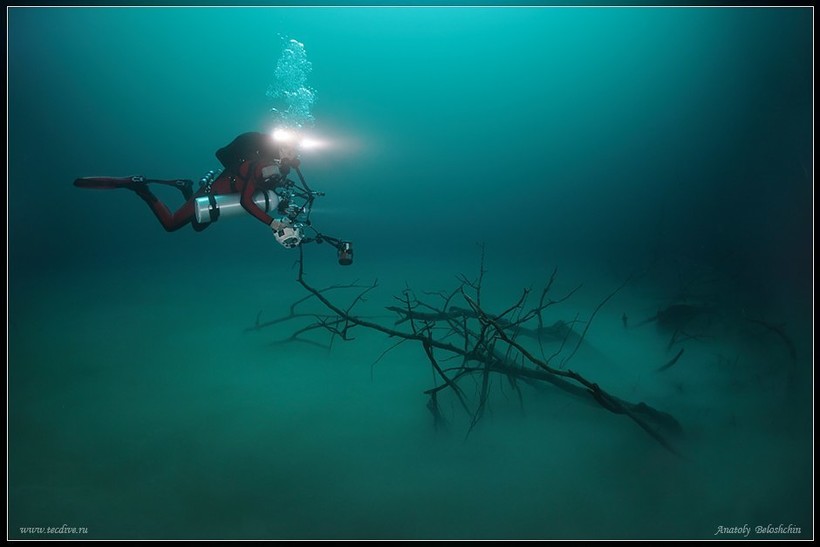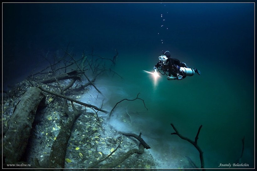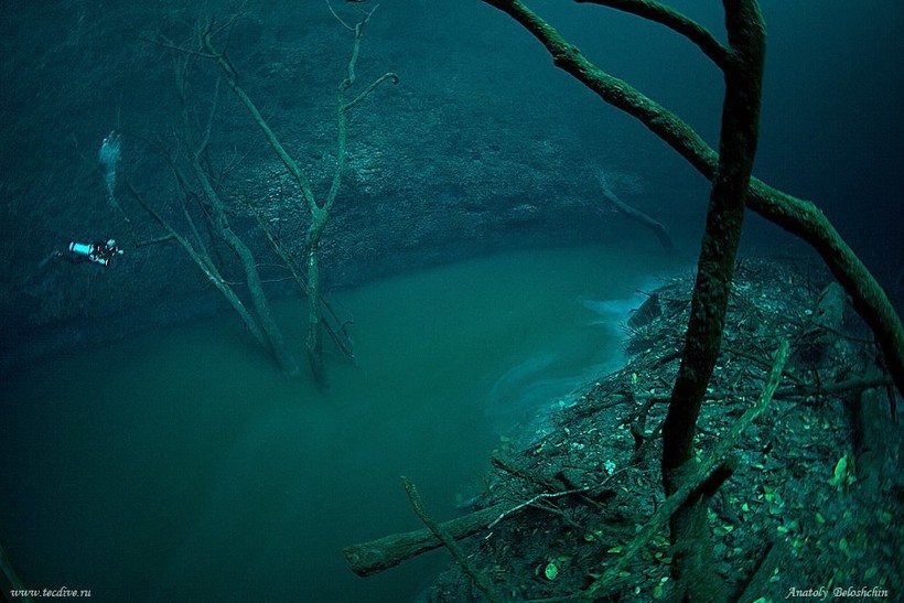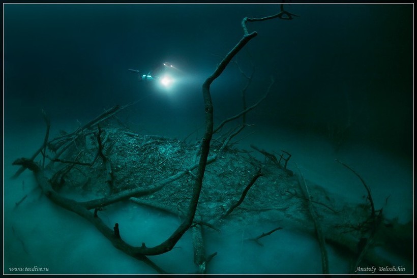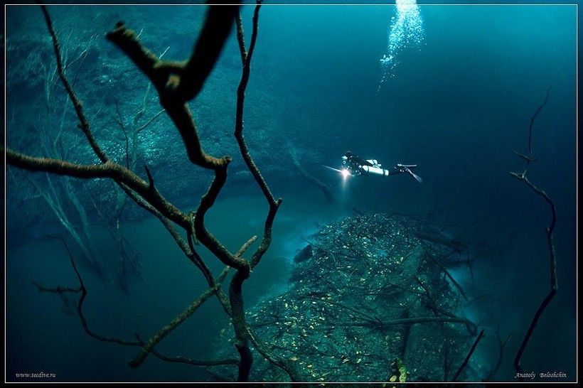 Получается, что дайверы плавают над темной толщей воды, словно прогуливаясь в мрачном лесу. Странный пейзаж дополняют коряги, ветки, которые торчат из стен сенота. Кроме того, на дне есть возвышение, выступающее из галоклина: такой своеобразный остров, видимый в густом тумане. Всю эту завораживающую красоту удалось запечатлеть нескольким фотографам, в том числе и Анатолию Белощину.