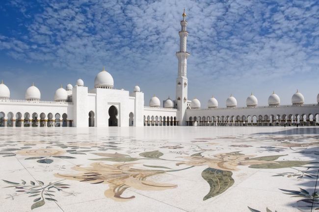 Выполненные из ярких плиток и белого рельефного мрамора цветочные мозаики, которые граничат с главной площадью Великой Мечети, являются потрясающим всплеском цвета на фоне этого ослепительного белоснежного сооружения.