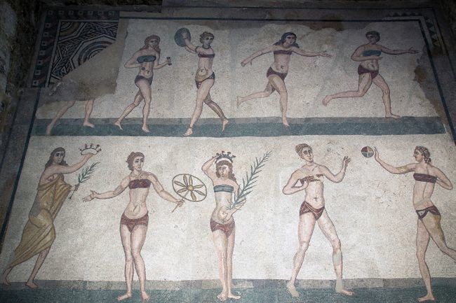 Раскопки на холмах Сицилии, проводившиеся здесь более семидесяти лет назад, выявили одну из самых богатых и разнообразных коллекций римской мозаики в мире. Самое знаменитое изображение представляет одетых в бикини женщин, занимающихся тяжелой атлетикой и метанием диска.