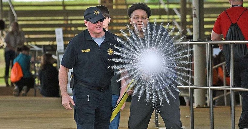 Для удачного кадра нужен всего лишь правильный момент. Студент выпускает воду из шланга.