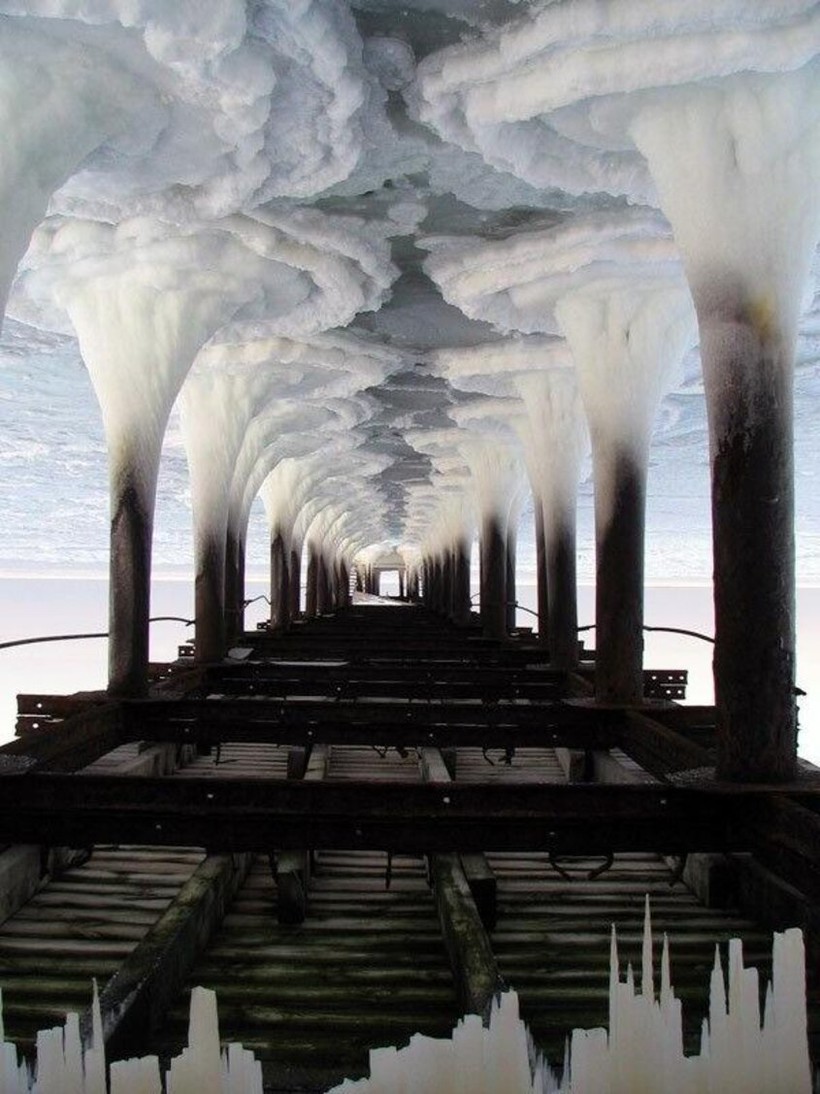 Заледеневшие столбы причала одного из озер на перевернутой фотографии напоминают огромный индустриальный город.