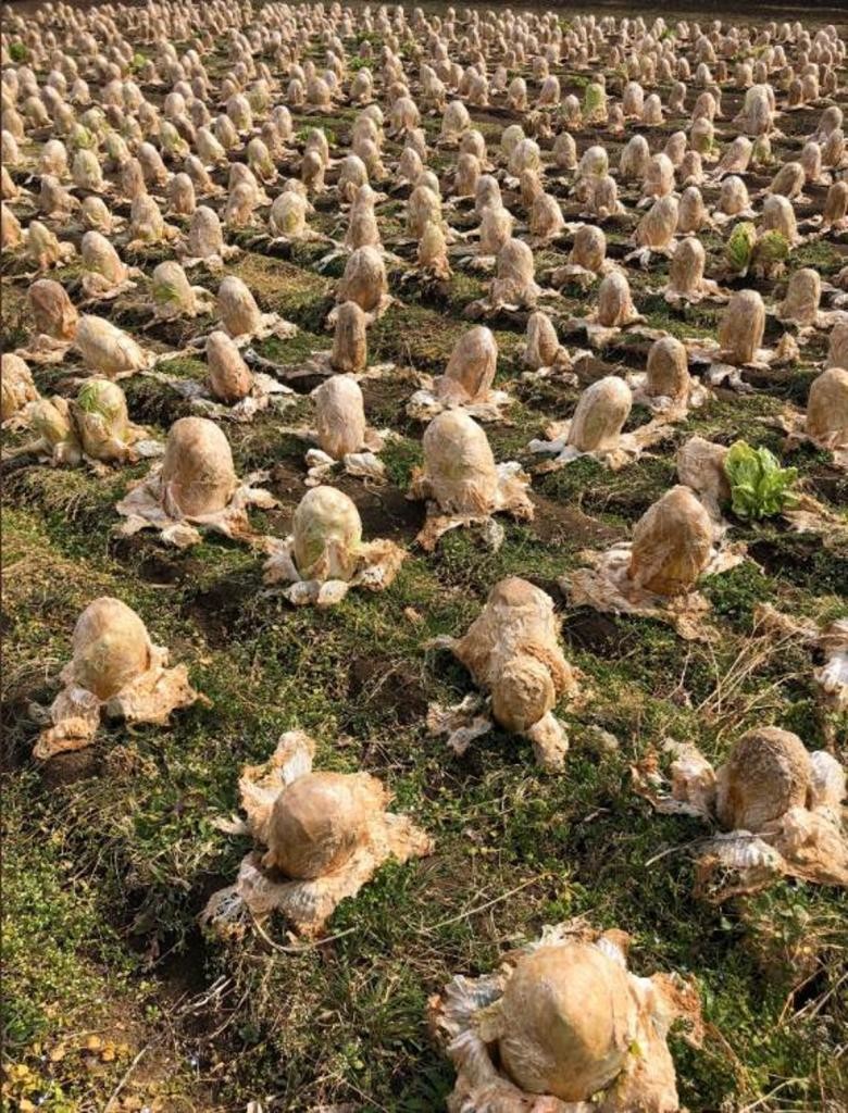 Подросшие на полях саженцы китайской капусты напоминают скопление инопланетных паразитов из фантастических фильмов ужасов.
