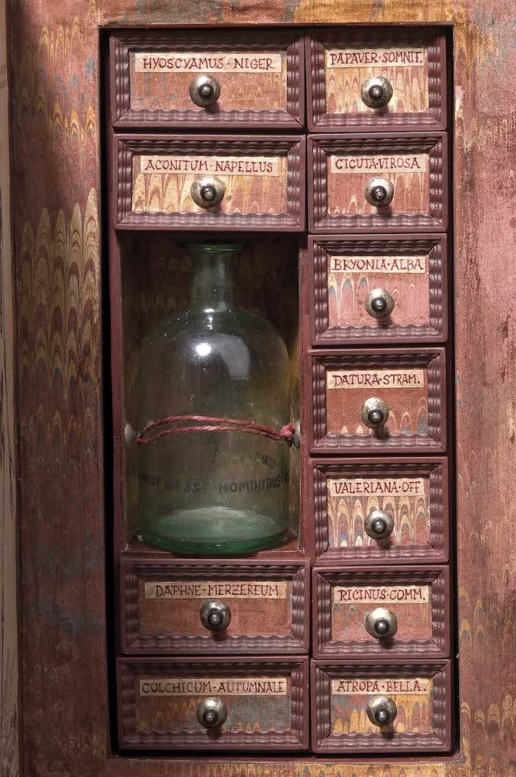 Может быть, называть это изделие «Шкатулкой отравителя» — преувеличение, но то, что оно уникально, это абсолютно точно. На месте страниц расположены одиннадцать небольших ящиков разного размера с аккуратными этикетками, на каждой из которых прописано, какое растение содержится в каждом ящичке. Конечно, многие из этих растений, были ядовитыми, но часть из них использовалась во врачебных целях, что позволяет переквалифицировать этот шкаф из «Шкатулки отравителя» в медицинский.