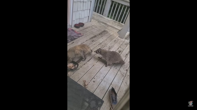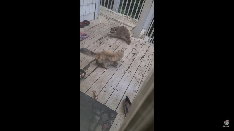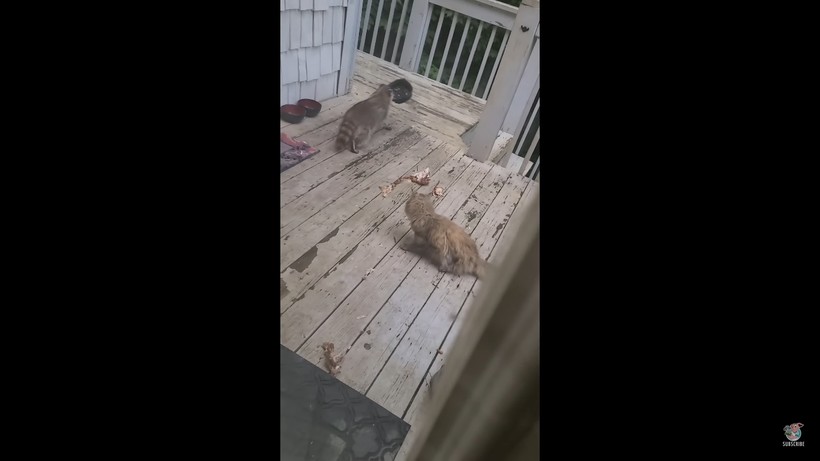 Как пишет хозяин кошки, его любимица наслаждалась остатками курицы-гриль на веранде, когда к ней сзади подкрался енот. Кошка не слышала зверька, а потому, когда енот схватил ее за заднюю лапу, отскочила от тарелки в сторону. Воришка, не желая упускать момент, схватил лапками тарелку и побежал с веранды. Но вот незадача — курица вылетела из посуды и осталась лежать на веранде, а енот остался ни с чем. Как написал бы Иван Андреевич Крылов «Мораль басни такова: хочешь есть, хватай курицу, а не тарелку».