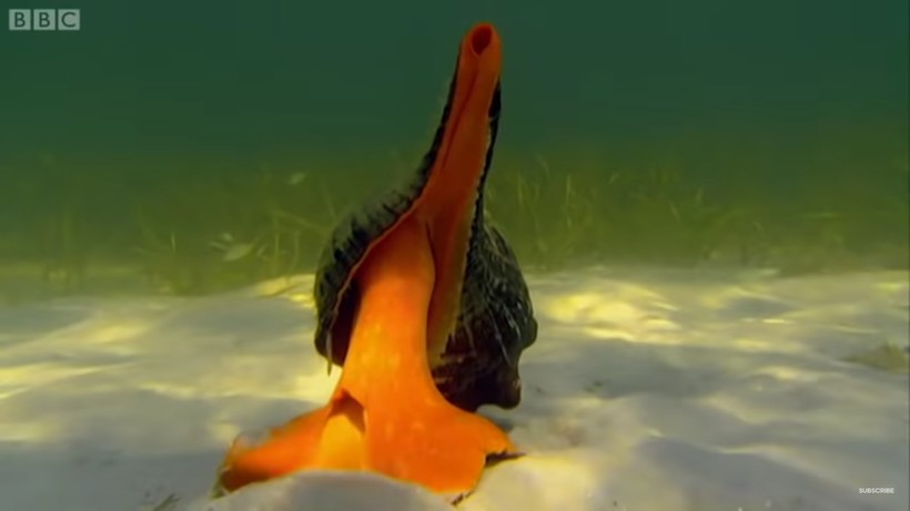 «Улитке-тюльпану кажется безопасным патрулировать территорию канала в поисках еды. Но так ли это? — рассказывает диктор, показывая нам лошадиного моллюска. — Это довольно большая разновидность улитки. Она весит около 5 кг и может не бояться любой акулы. Она жаждет полакомиться улиткой-тюльпаном. Последняя, чувствуя приближающуюся опасность, убегает, если можно так сказать. В их мире лошадиная улитка как Ferrari и легко может настигнуть жертву. Она переворачивает тюльпана, и тот, измученный погоней и атакой, становится желанной добычей».
