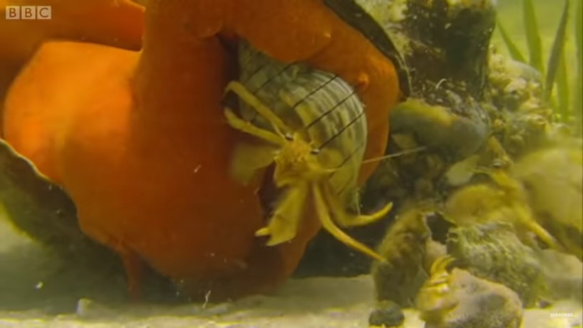 «Остался еще час, прежде чем вода поднимется и крупные хищники смогут охотиться. Но запах умирающей улитки распространяется на весь залив. К этому аромату неравнодушны раки-отшельники. Для них очень важна защита, которую было бы сложно прокусить. Их хитиновый панцирь не такой прочный, как хотелось бы, а потому эти существа нашли другой выход из положения. Они забираются в пустые раковины улиток-тюльпанов. Эти домики очень комфортны для рачков, а потому среди них большая конкуренция за раковину», — продолжает рассказ автор.