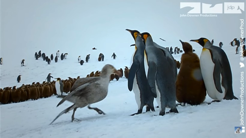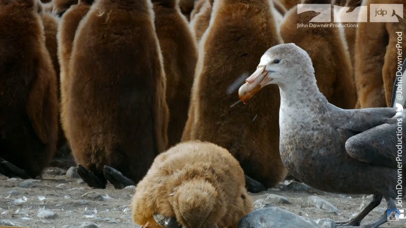 «После знакомства робот решил осмотреться. Его внимание привлекла пара родителей, которые кормят своих птенцов рыбой прямо изо рта. Так рыба поступает в организм птенцов прожеванная и разогретая. Им всего 6 месяцев, нужно больше времени, прежде чем они сами станут добывать рыбу. Но тут в поле зрения шпиона попадают белые ржанки — небольшие птицы, обитающие в Антарктиде. Они клюют все, что только могут. Другие пингвины просто отгоняют ржанок, но не шпион. Поэтому одна из птиц начинает клевать его ногу и роняет робота на снег», — продолжает рассказ диктор.