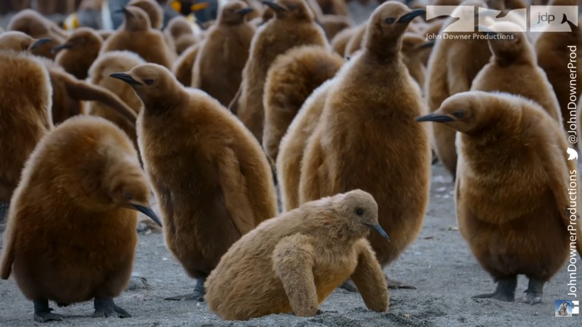 «Среди стаи птенцов императорских пингвинов появилось странное прибавление, — говорит диктор, — шпион в виде птенца, покрытый густым коричневым оперением. Его подбросили в место, где собираются все птенцы под присмотром взрослых пингвинов. Другие птенцы заметили новичка и решили завести с ним дружбу. Один из них начинает хватать за клюв, а потом чистить перья на голове шпиона».