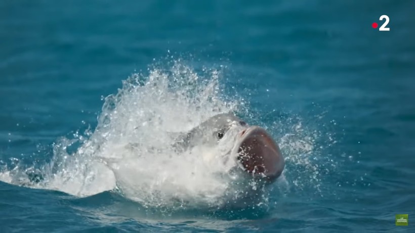 Каранксы, как торпеды, развивают большую скорость и буквально на плаву захватывают птицу, которая отдыхает на воде. Они хватают ее своим огромным ртом и утаскивают под воду.