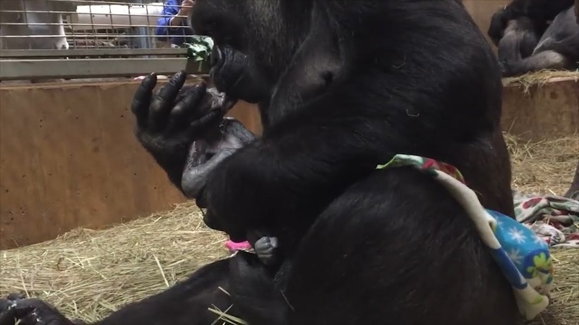«Горилла, ставшая мамой впервые, не может перестать покрывать своего новорожденного поцелуями. Калайя — 15-летняя западная равнинная горилла, которая живет в зоопарке Смитсоновского университета. Она только что родила сына и демонстрирует ему привязанность. Младенца назвали Моки, что означает «маленький» на языке лингала, который распространен в Республике Конго. Прямо перед родами тренер научил Калайю основным навыкам материнства, таким как поцелуи и уход, чтобы повысить вероятность того, что она будет заботиться о Моки. То, что увидели смотрители зоопарка, выглядело как бесконечная любовь гориллы к детенышу», — комментирует видео диктор.