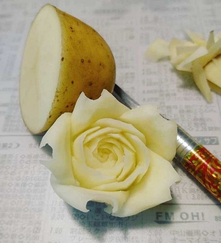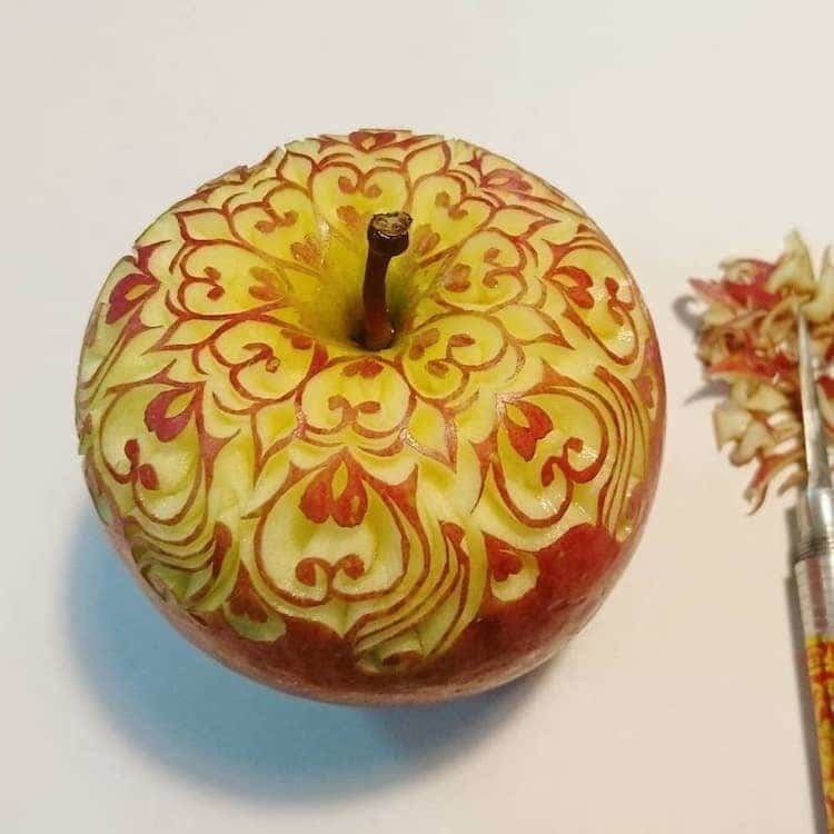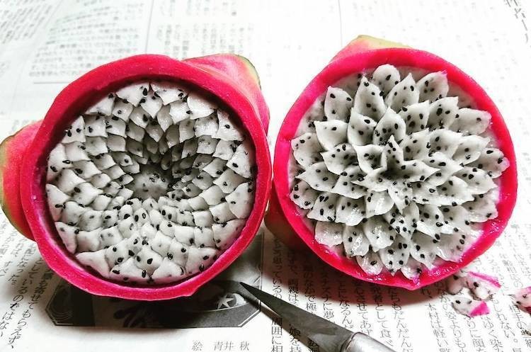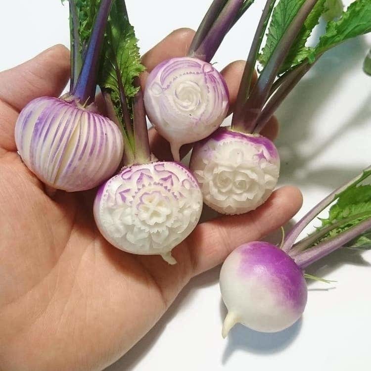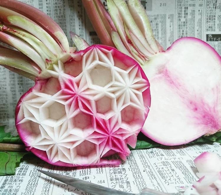 От бэнто-боксов до скульптур из редьки — превращение еды в искусство является весьма популярным развлечением в Японии. Вдохновленный традиционным национальным искусством декоративного гарнира (известным как мукимоно) и тайской резьбой по фруктам, японский шеф-повар и «кулинарный» художник Такехиро Кишимото создает замысловатые мотивы и узоры на фруктах и овощах.