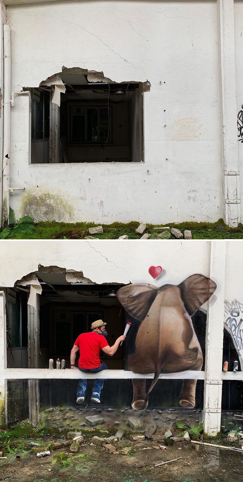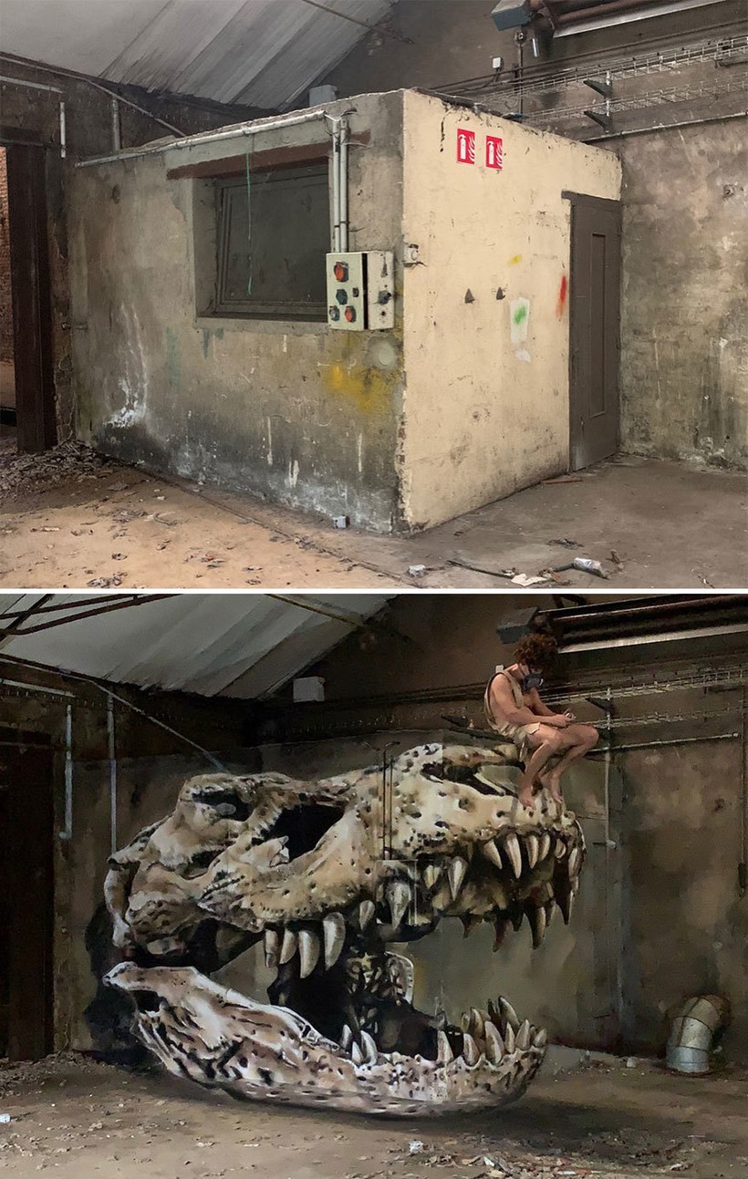 Фирменный знак французского уличного художника — его чрезвычайно детальный и реалистичный стиль. Он мастерски изображает всевозможных животных, таких как динозавры и змеи, а также другие самые разнообразные мотивы. Его работы выглядят безупречно и больше напоминают огромную склеенную фотографию, чем граффити-рисунок. В них есть необходимое — детали, тени, блики, блеск и уникальный авторский стиль. Еще одним потрясающим навыком француза является способность рисовать с перспективы, создавая глубокую оптическую иллюзию, когда объект, кажется, просто выпрыгивает из стены. Но самое поразительное то, что этот талантливейший художник — самоучка!