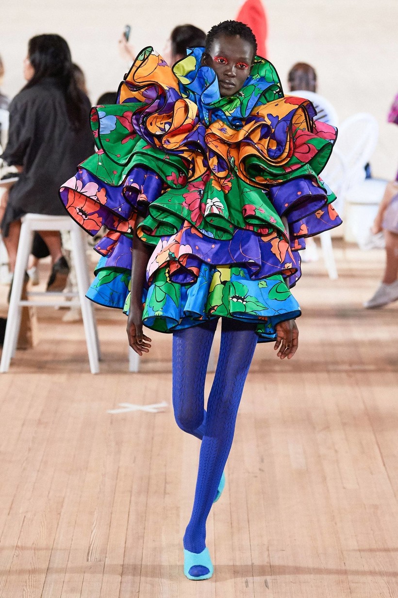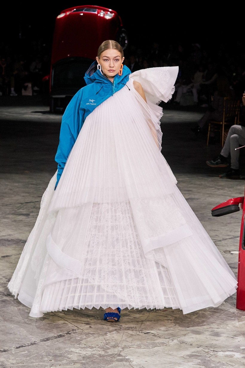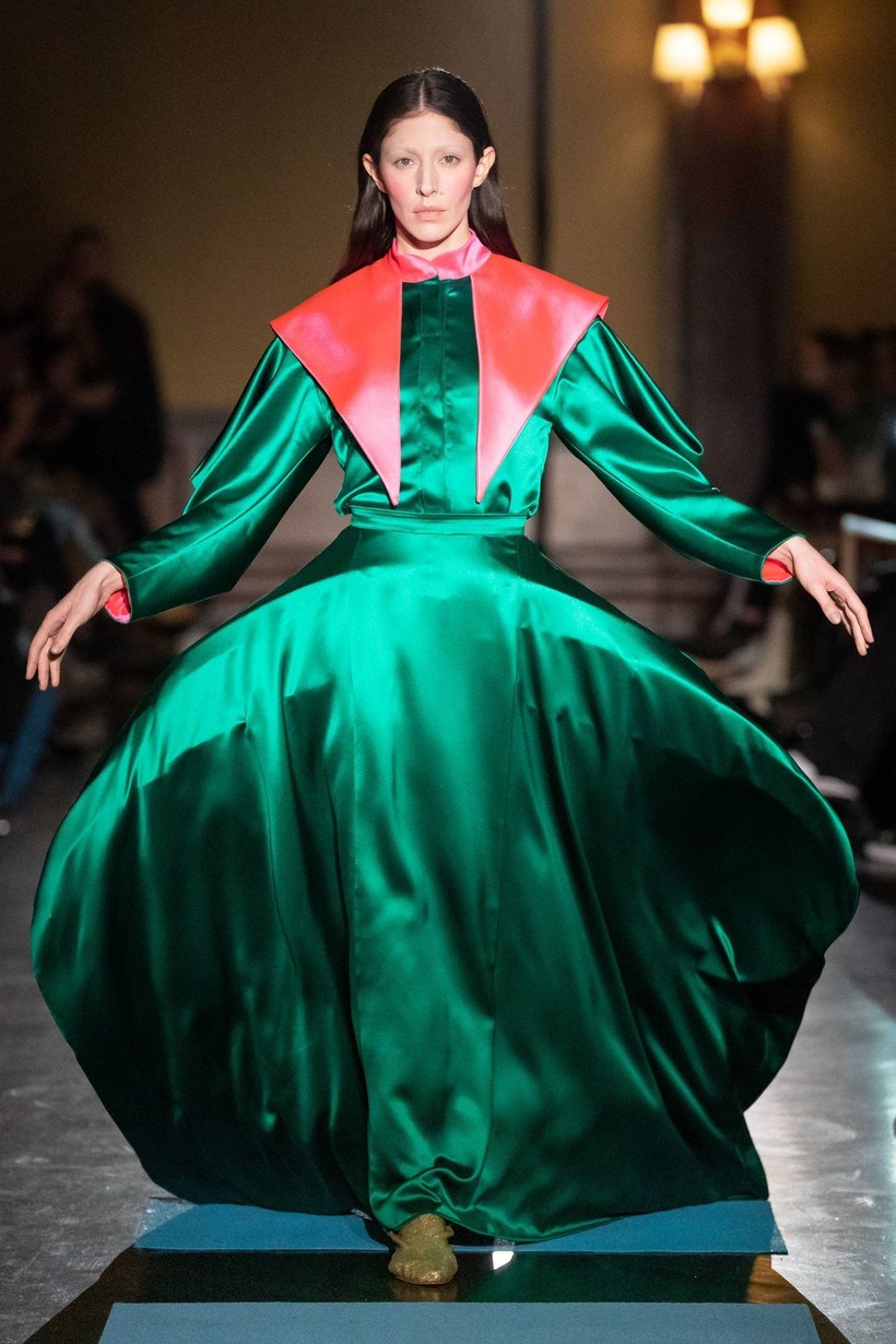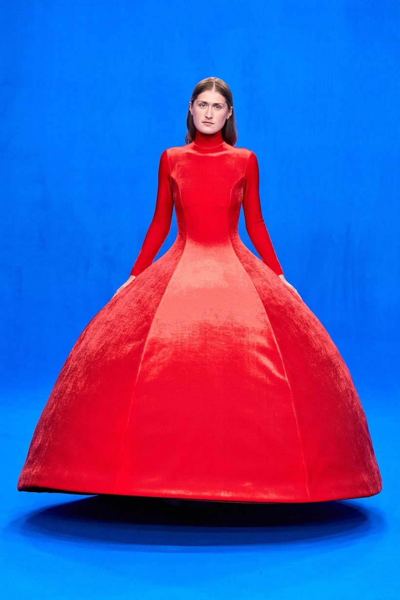 Но все же если несколько месяцев назад подобные наряды выглядели на подиумах слишком нелепо, то сегодня одежда в духе «держись подальше» и «соблюдай дистанцию» уже не кажется настолько странной. Ведь, согласитесь, чем больше подол твоего платья, тем легче держаться на расстоянии от других людей. И да, если обозначить свои границы таким образом, есть большая вероятность, что никто не будет дышать тебе в спину в очереди в магазине.