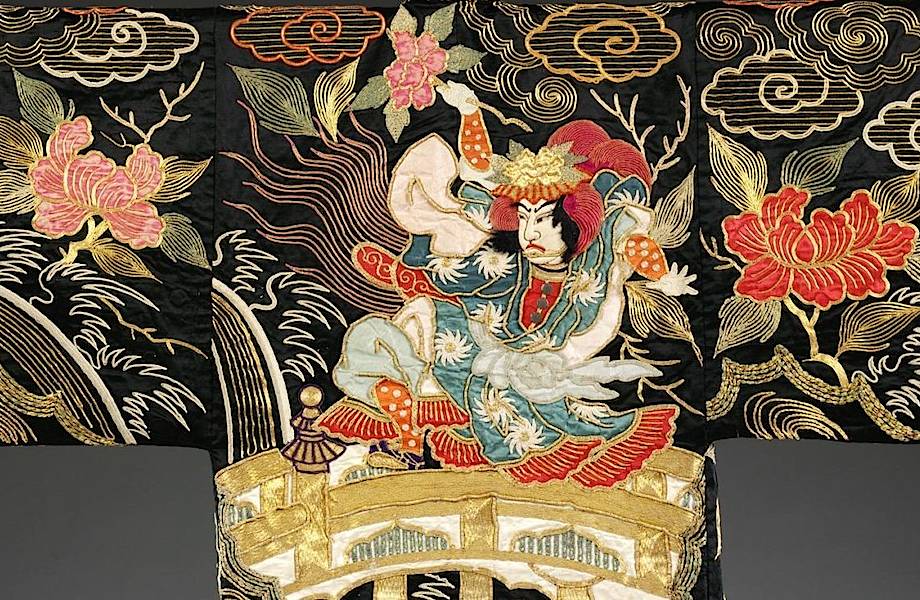 Мотив на этом чрезвычайно пышном кимоно (учикаке) является театральным, относящимся к китайской легенде о Шакке (каменном мосте). Легенда повествует о мосте через крутое ущелье недалеко от вершины горы Сэйре, который, как считается, ведет к буддийскому раю и охраняется шиши (мифическими львами). Пьеса, созданная по мотивам этой истории, завершается драматическим танцем льва. Фигура на мосту — это актер кабуки, который воплощает дух шиши, в то время как ниже настоящие шиши нарисованы, окруженными пионами. Костюмы, которые носили на сцене, безусловно, должны были быть яркими и привлекательными, но мотивы обычно не были такими буквальными. Поэтому более вероятно, что это кимоно принадлежало высокопоставленной куртизанке.