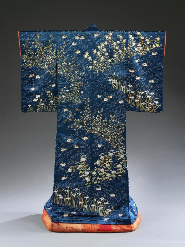 Сочетание нежной вышивки и темно-синей атласной ткани придает этому кимоно яркий и блестящий вид. На нем изображены утки среди цветов. Утиные пары являются символом супружеской гармонии, поэтому это кимоно могло быть частью свадебного приданого.