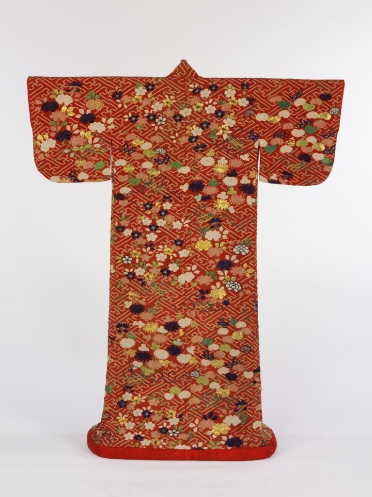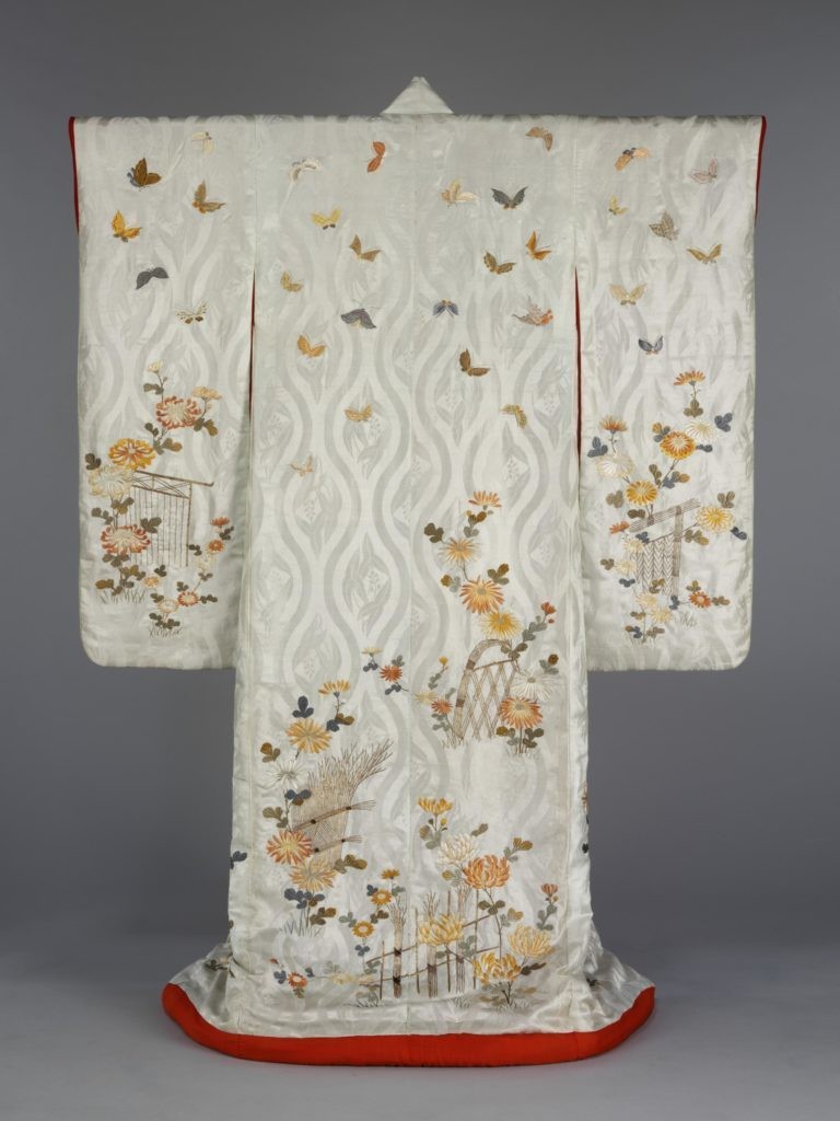 Кимоно-накидка (учикаке) с длинными раскачивающимися рукавами (фурисодэ). Вышитый белый фигурный шелк и подкладка из красного атласа. Длинные висячие рукава на подкладке из красного шелкового крепа. Богатство этого кимоно предполагает, что его, вероятно, носила невеста. Мерцающее белое полотно было расшито хризантемами и другими цветами, а также большими бабочками, среди которых нет двух одинаковых.