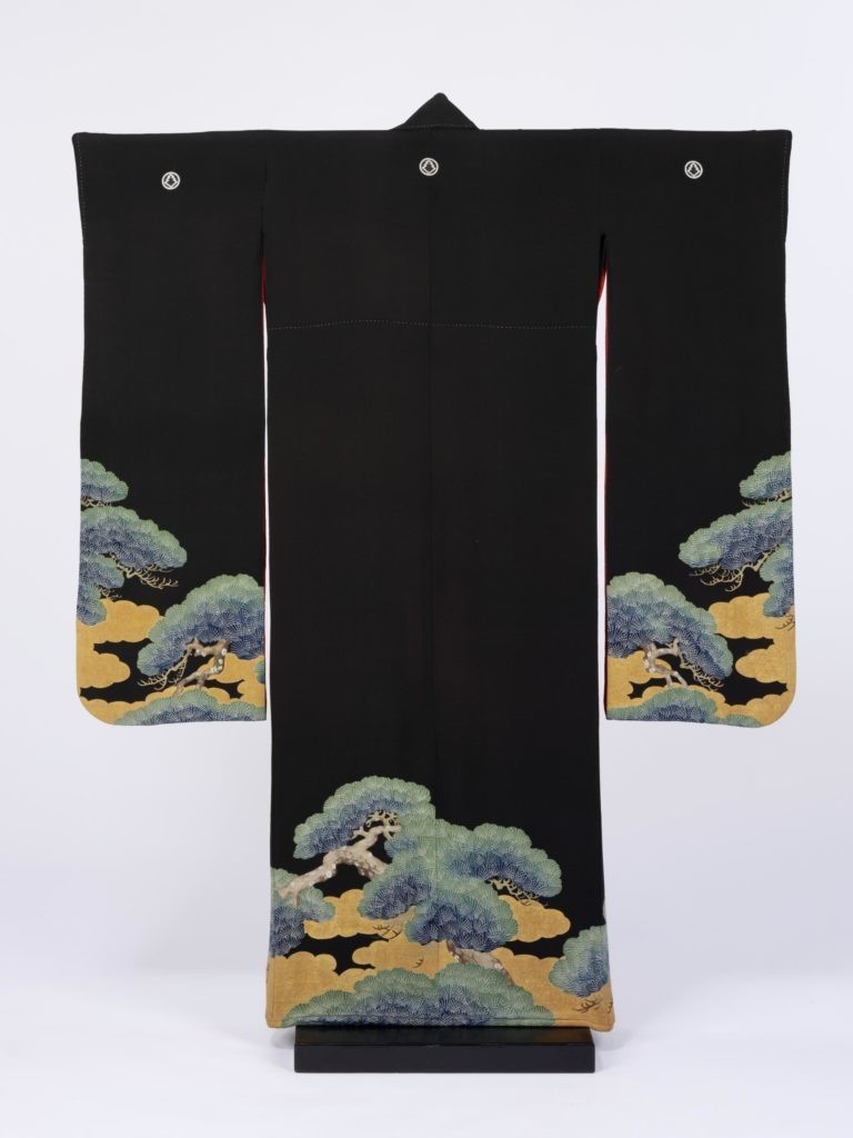 Элегантное изображение сосен на этом кимоно было создано с использованием техники Юдзен. В японской культуре сосна олицетворяет долголетие, удачу и стойкость. Она обычно связана с добродетелью и долгой жизнью, даже бессмертием. Сосна является символом японского Нового года, возрождения, обновления и светлого будущего.