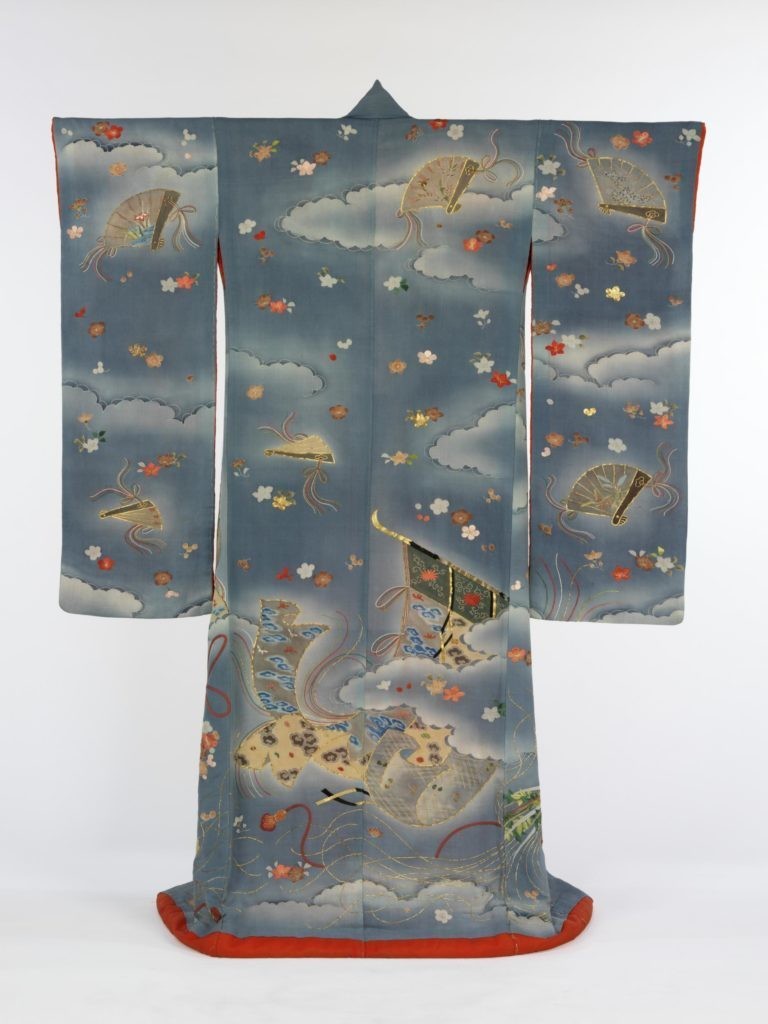 Это элегантное и узорчатое кимоно показывает красоту текстиля через украшения. Ткань подвешена на специальную подставку и словно трепещет на ветру, передавая движение облакам, вееру, падающим вишневым цветам.