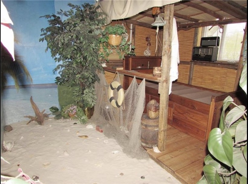 Устав от глобальных разговоров о Вселенной, можно с легкостью переместиться прямиком на райский остров, ведь в соседней комнате расположен пляж с настоящим песком.