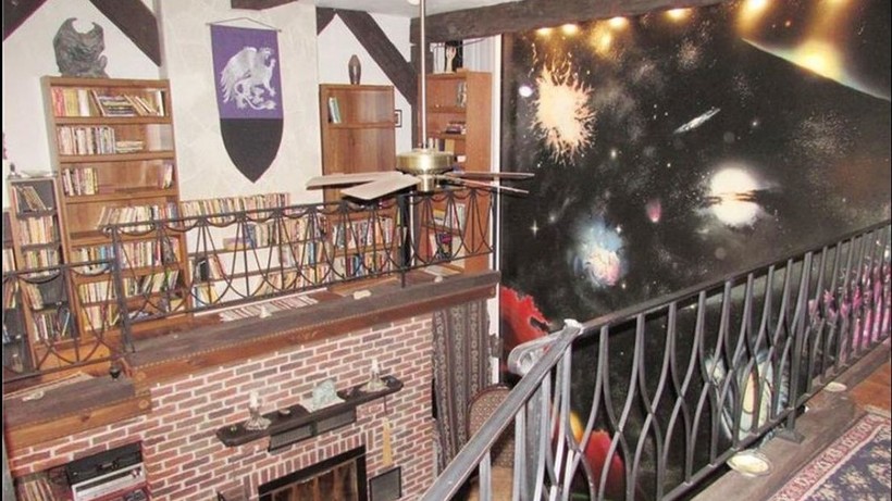 С лестницы открывается вид на стену с изображением космической панорамы. Взгляд привлекают уникальные старинные статуэтки, узорчатые ковры и большой камин, обложенный кирпичом.