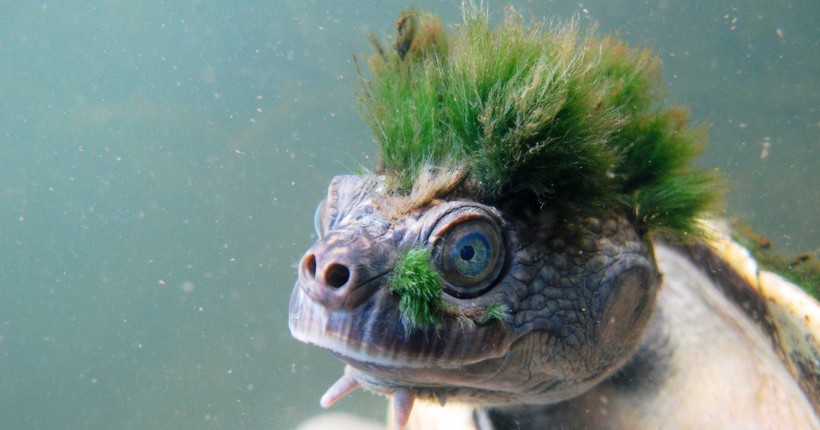 Черепаха с ошеломительной прической из водорослей проживает в реке Мэри, Квинсленд. Такой зеленый покров у нее по всему панцирю.