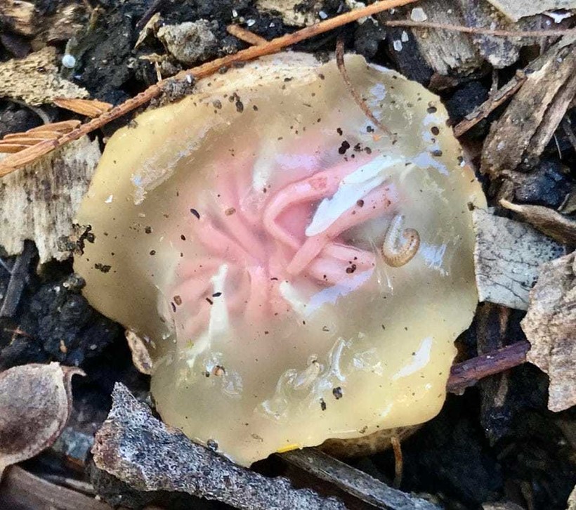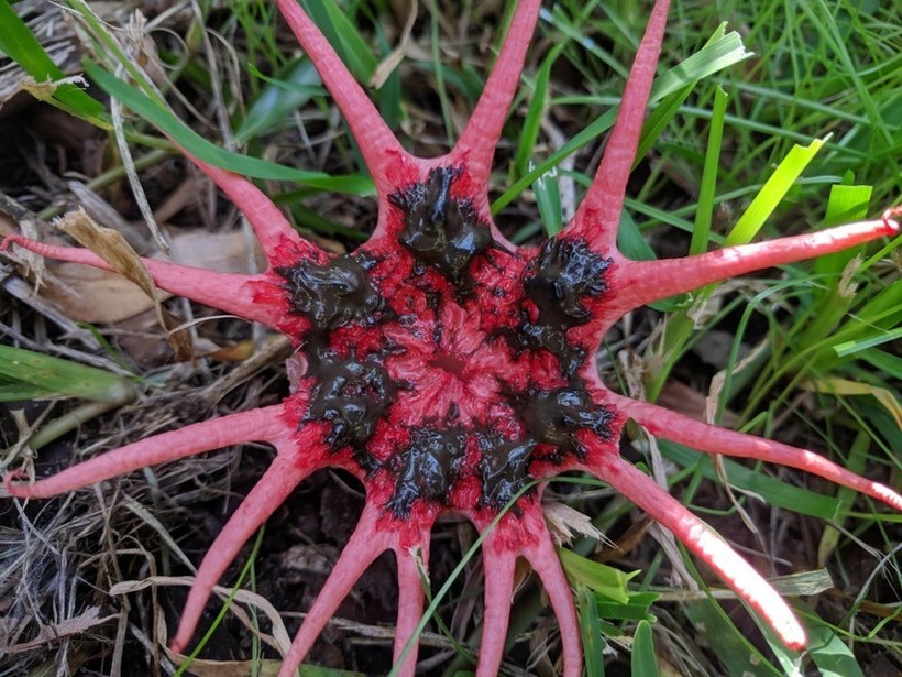 Гриб Aseroe rubra, произрастающий в Мельбурне. Герой на фото ниже еще не совсем вырос.
