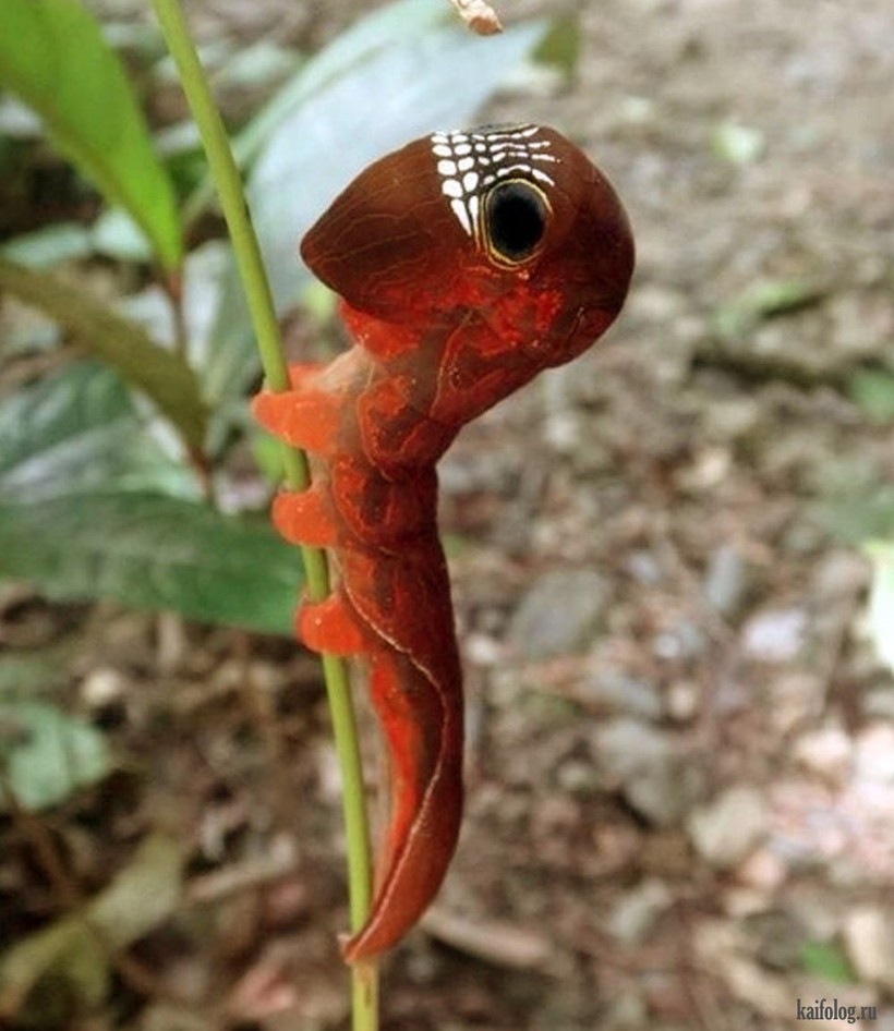 Также здесь можно наблюдать удивительную гусеницу с нереальным окрасом, ее еще называют гусеница-череп. В скором времени она превратится в не менее очаровательную бабочку Phyllodes imperialis.