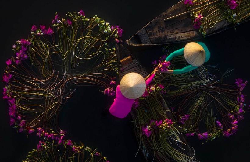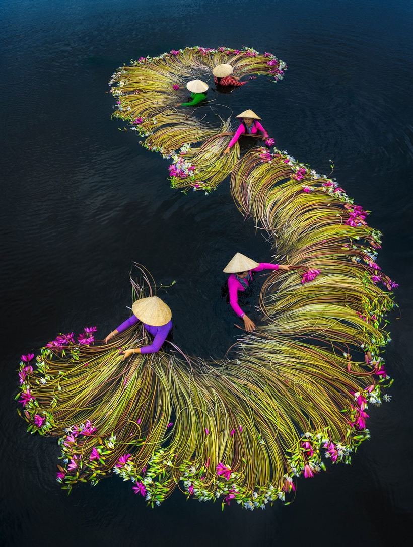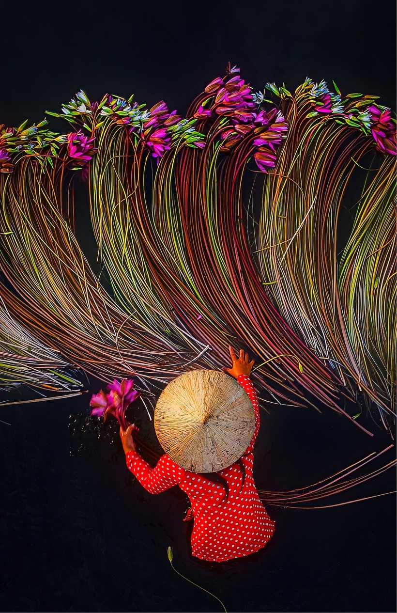 Выдержав сильную жару и высокую воду, Фам получил великолепную серию фотографий. Темные воды реки составляют приятный контраст красочному цветению и традиционным коническим шляпам, которые носят фермеры. Большинство лилий при этом темно-розового или белого цвета. А поскольку белые лилии цветут только ночью, их называют «призрачными цветами».