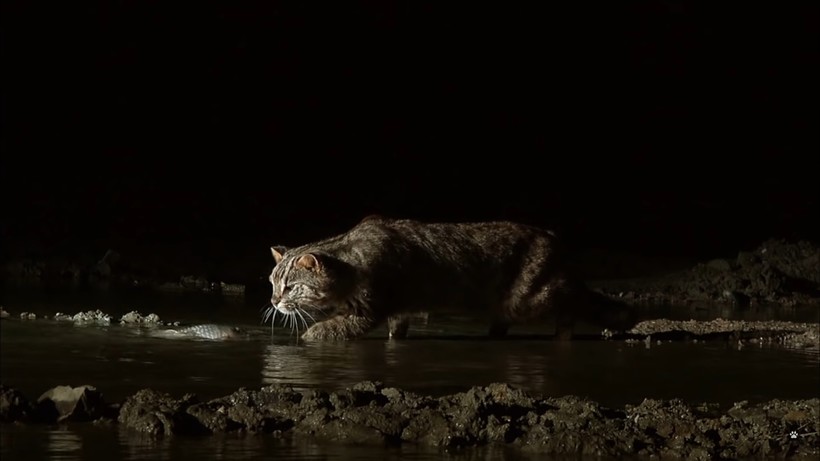 «В мире маленьких кошек рыболовы — это довольно крупные животные. Большой размер позволяет им сражаться с крупной рыбой и добывать ее. У этих коренастых кошек короткие ноги с длинными когтями и короткий хвост. Они проводят большое количество времени в воде, а потому не нуждаются в длинных и изящных хвостах, которые мешали бы их равновесию на болоте. Это единственные в мире кошачьи, которые специализируются на ловле рыбы. Все кошки могут есть рыбу, но только рыболовы ныряют мордой в воду, чтобы схватить добычу. Они могут ждать у самой кромки воды часами, абсолютно неподвижно, пока не увидят добычу. Иногда им везет, и они находят крупную рыбу, попавшую на мелководье», — комментирует диктор.