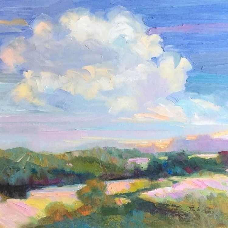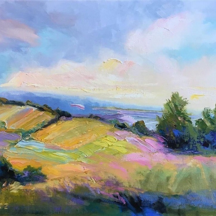 От цветочных полей, изображенных короткими точечными мазками, до облаков, созданных с помощью стремительных набросков пастельных оттенков — каждый пейзаж выглядит как слияние множества абстрактных форм. А отходя от полотна на несколько шагов назад, можно увидеть, как искусно Шарлотта передает свет, тень и форму с помощью выразительных текстурных мазков. В ее картинах живет само лето со всем своим теплом, томлением и сладко-терпким ароматом.
