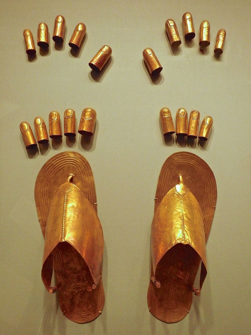 Найденные среди погребальных предметов трех жен Тутмоса III тонкие золотые сандалии и накидки для ног датируются серединой 15-го века до нашей эры. Тутмос III (ум. 1425 г. до н. э.) успешно правил Сирией и Палестиной, был покровителем искусств и принес процветание Египту. Его три жены — Менхет, Менуи и Мерти — были родом из Сирии, в 1916 году их общую могилу нашли местные жители.