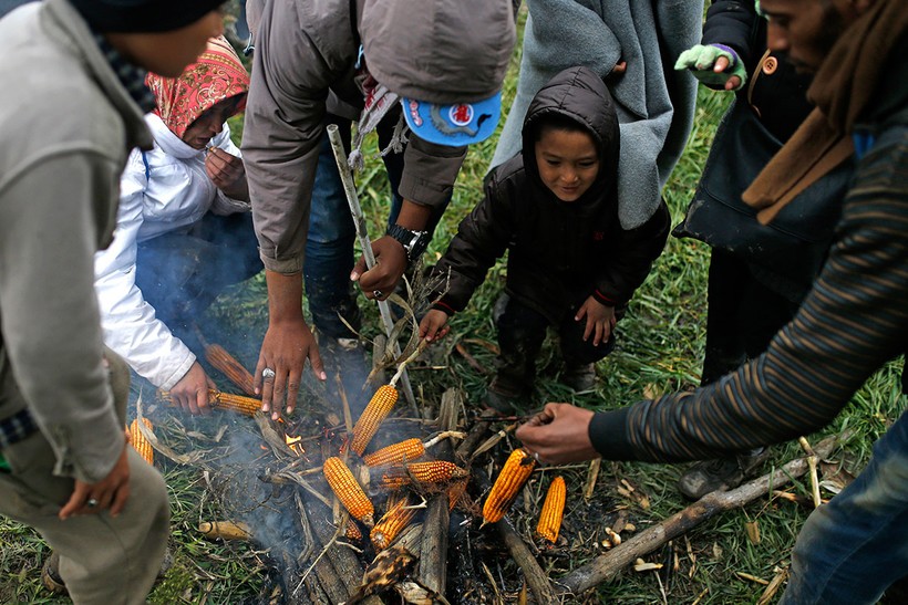 После пересечения границы Сербии и Хорватии беженцы остановились перекусить.