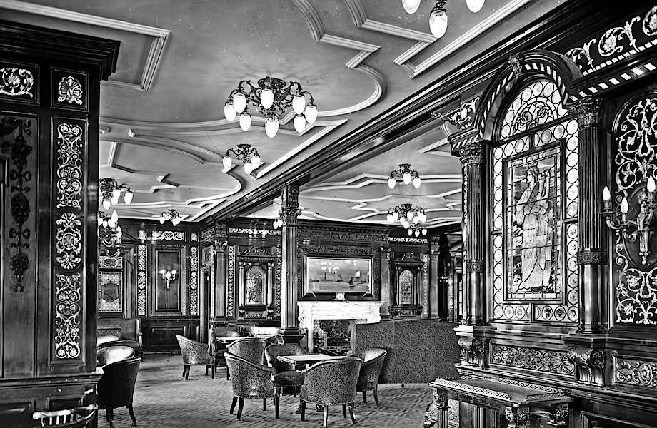 Первые кадры — этапы строительства «Титаника» и его морские испытания. Далее мы видим комнаты для пассажиров первого класса, которые были оформлены в разных стилях: от грузинского и якобинского до итальянского Ренессанса. Большая лестница — одна из самых красивых частей парохода. Затем показан номер для курящих пассажиров и гимназия — так раньше называли гимнастический или тренажерный зал. На «Титанике» был даже бассейн, как на современных лайнерах.