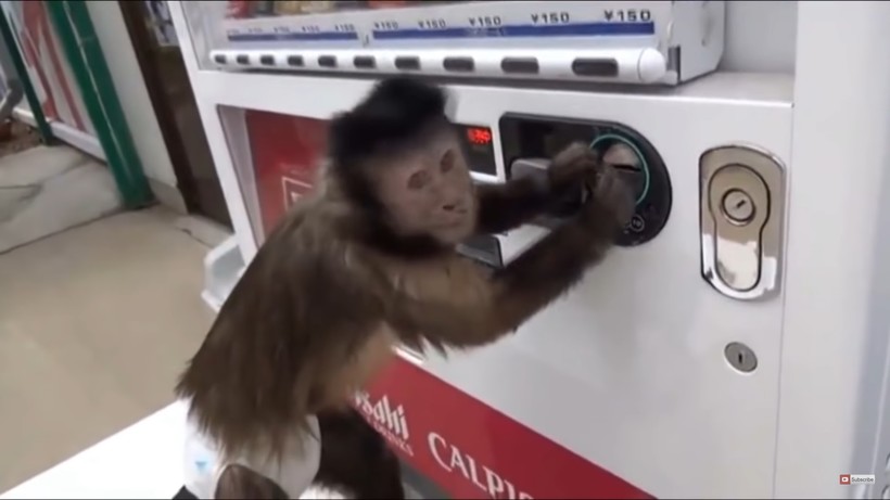 Капуцины — это маленькие забавные обезьянки, которые часто становятся домашними питомцами, потому что они ведут себя как дети. Этих очаровательных животных даже берут для съемок в фильмах, потом что они могут разнообразить самый скучный кадр. Эти приматы считаются очень умными, а также они могут издавать различные звуки и выражать свое настроение: плакать смеяться, злиться, переживать. В видео малыш-капуцин покупает напиток из автомата: он запускает две монетки в аппарат и начинает стучать по кнопкам, чтобы выбрать нужный товар. Когда покупка произошла, то капуцин берет сдачу из автомата и отдает ее хозяину, а сам возвращается забрать напиток.