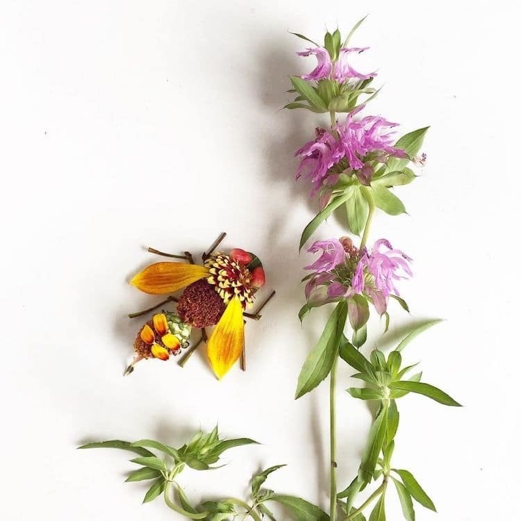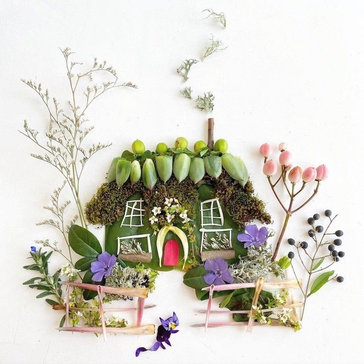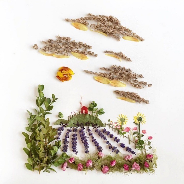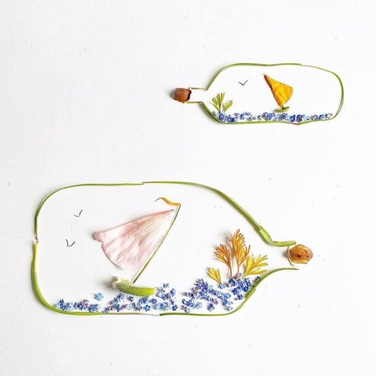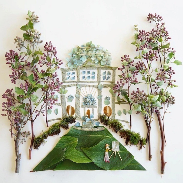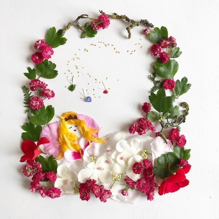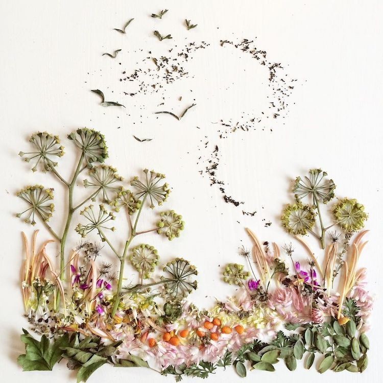 Каждый лепесток, лист, камень или веточку Бриджит подбирает во время прогулок неподалеку от своего дома. После того как художница собирает все необходимые для картины ботанические материалы, она распределяет их на бумаге, превращая во всевозможные игривые сцены. Закончив колдовать над иллюстрацией, Коллинз фотографирует работу, прежде чем чудесная композиция увянет.